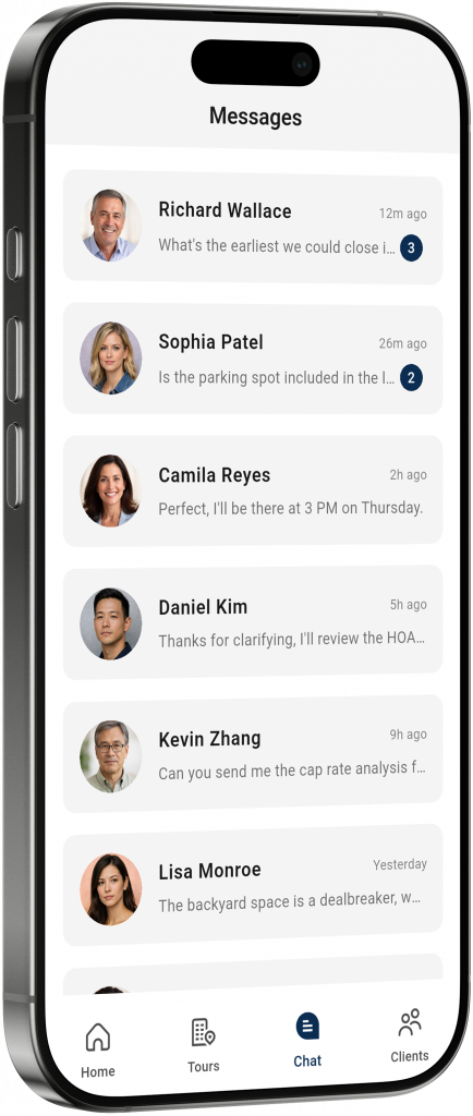 Clients can message you directly inside the app, keeping conversations organized and connected to their property searches.